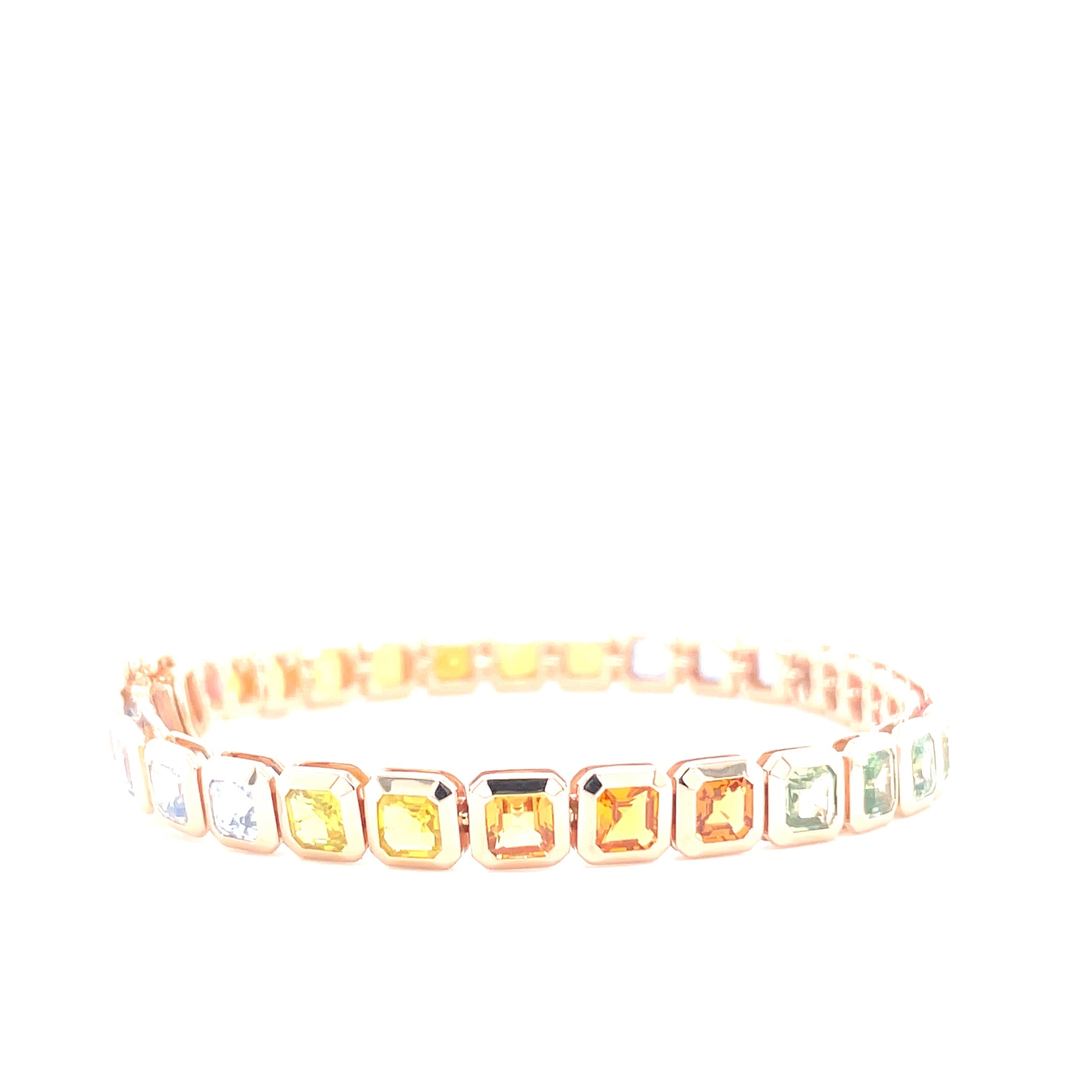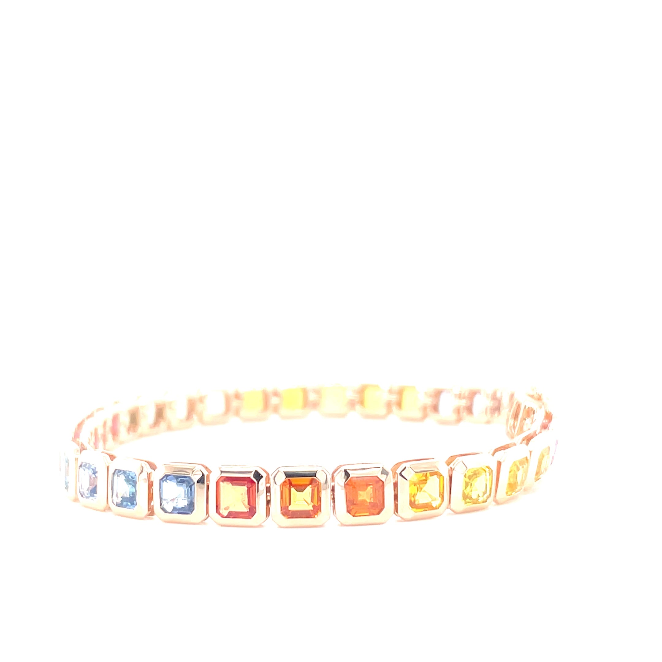 Deze 18kt rosegouden tennis armband is bezet met radiant geslepen, multicolor saffieren. De saffieren zijn in de regenboog kleuren verlopend met een totaal gewicht van 11.50ct.