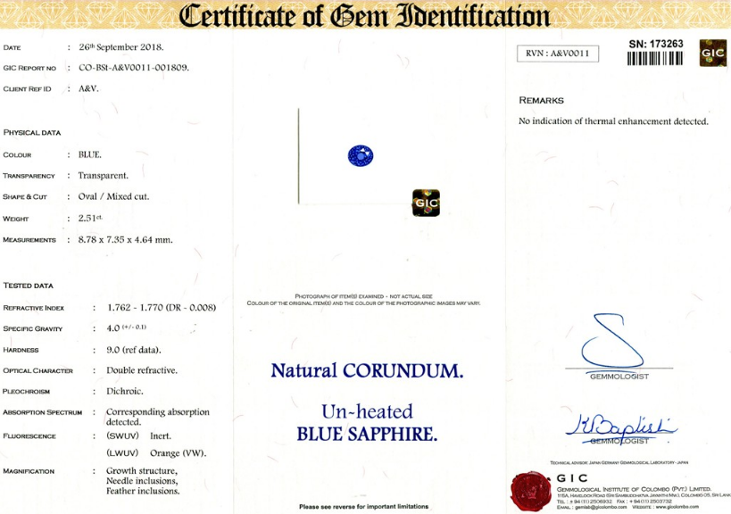 Stenen: Saffier (2.51ct), Diamant (VS1 F 0.62 ct totaal)
