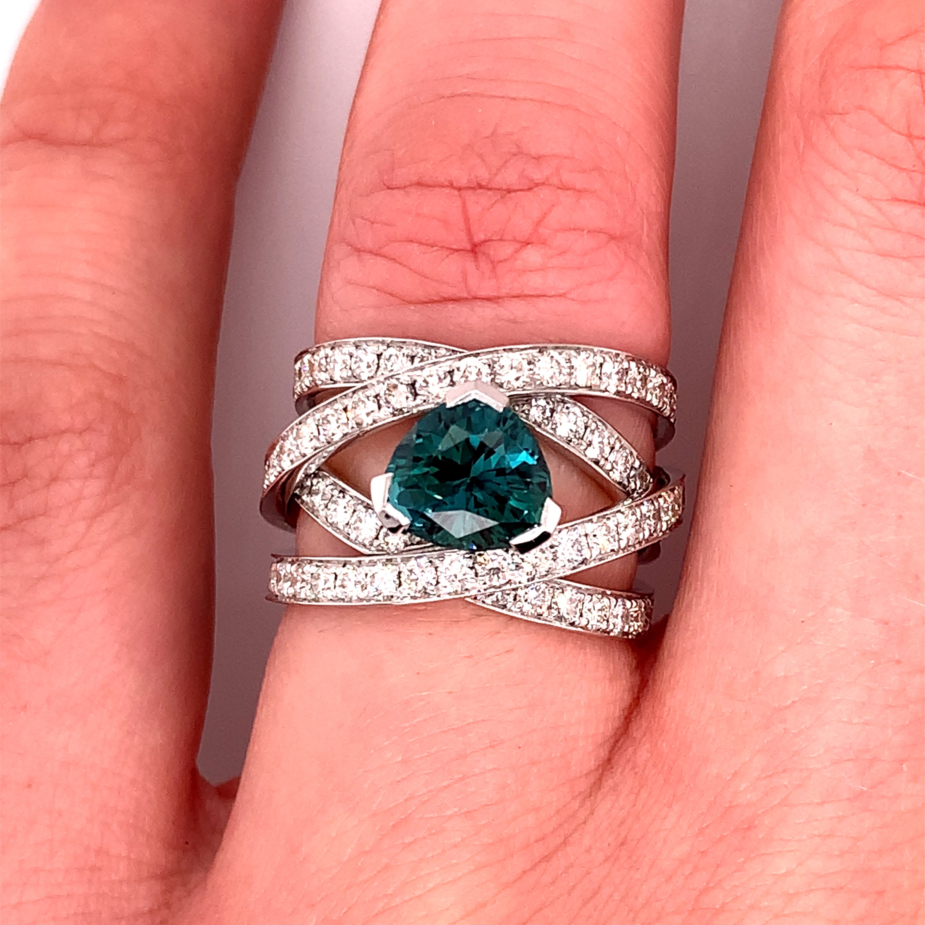 Deze tijdloze 18kt witgouden MV-signature ring is bezet met een zeldzame indigoliet toermalijn. De banen zijn deels met diamant bezet en vormen de initialen van ons huis. MV, Marcel Vermeulen heeft dit model in 2014 speciaal ontworpen voor zijn vaste klanten. Sindsdien wordt deze ring vervaardigd met verschillende middenstenen en wordt hij wereldwijd dagelijks met veel plezier gedragen.