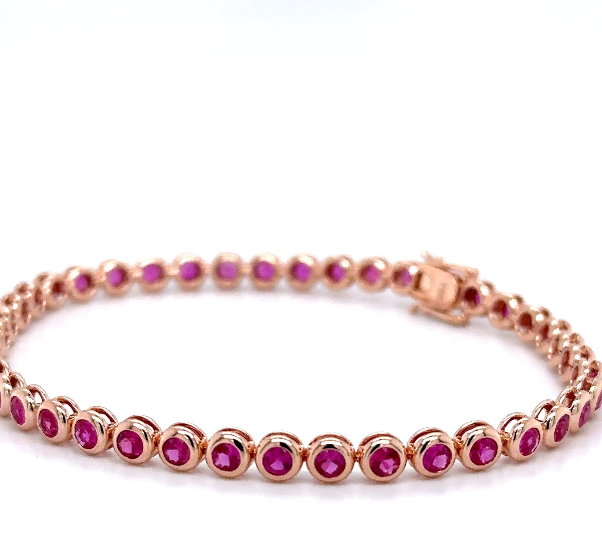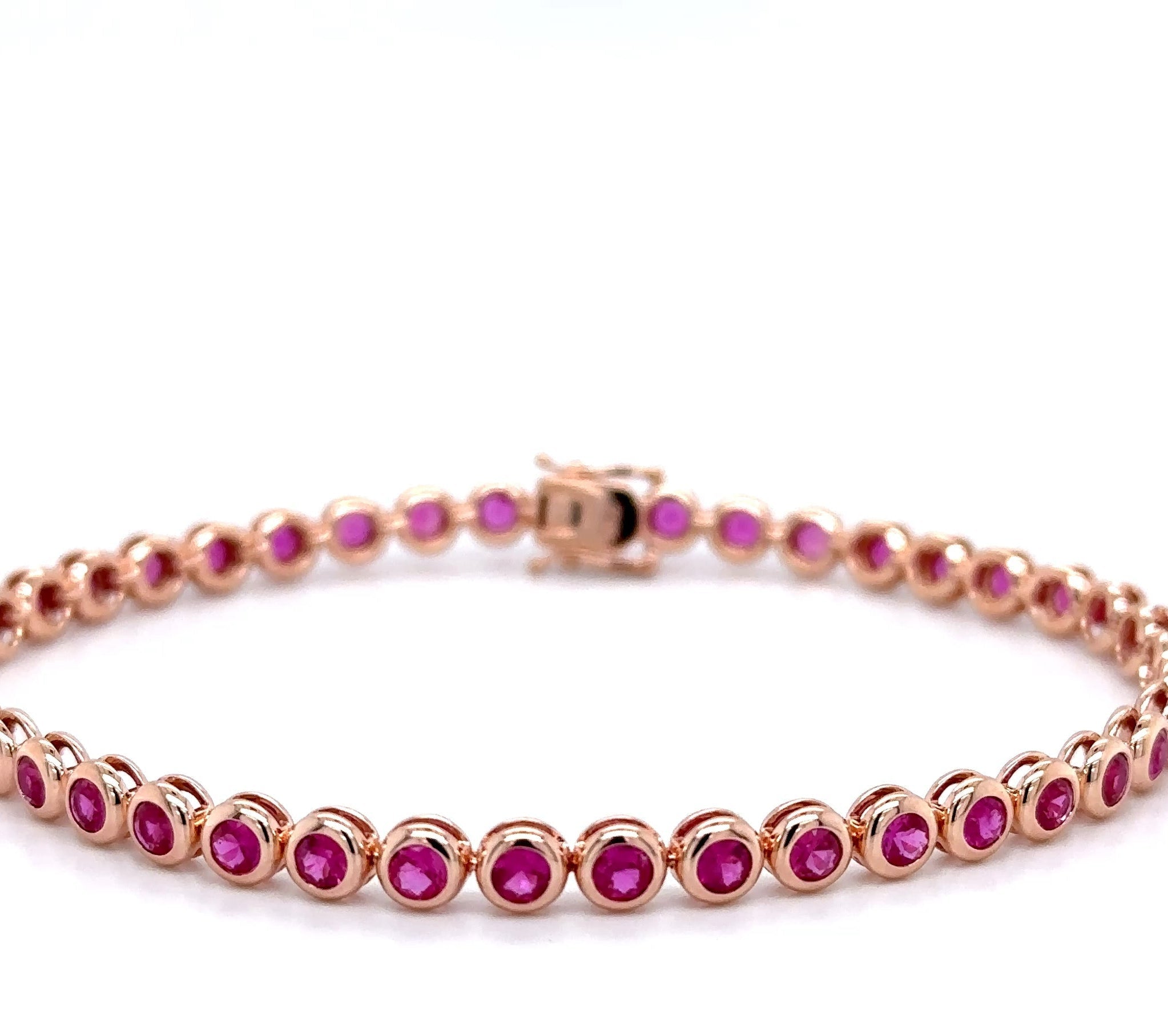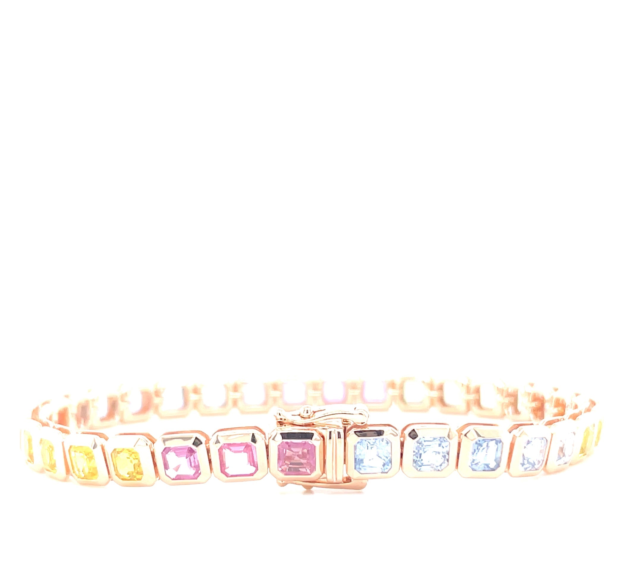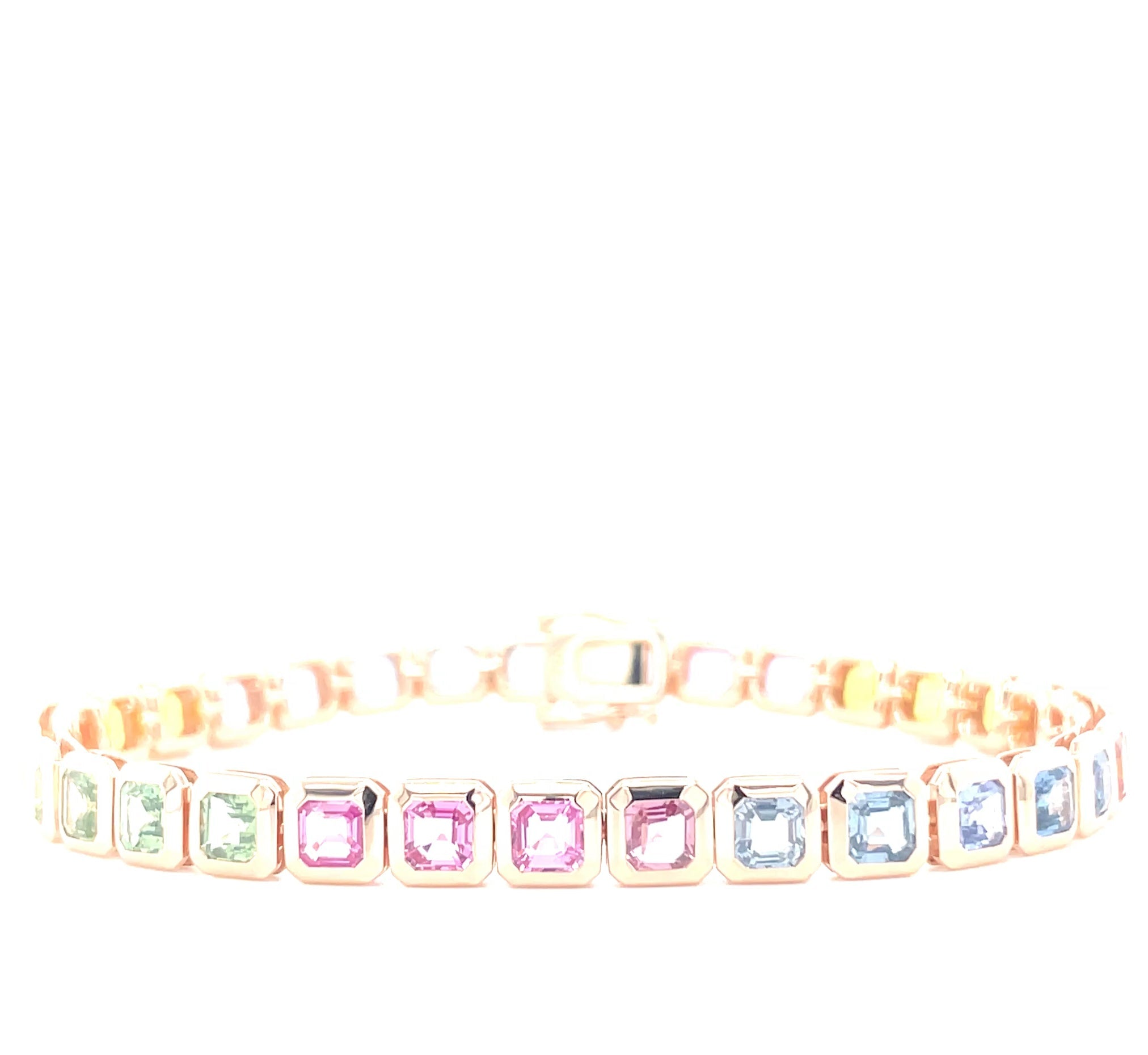 18kt rosegouden tennis armband bezet met regenboog saffier