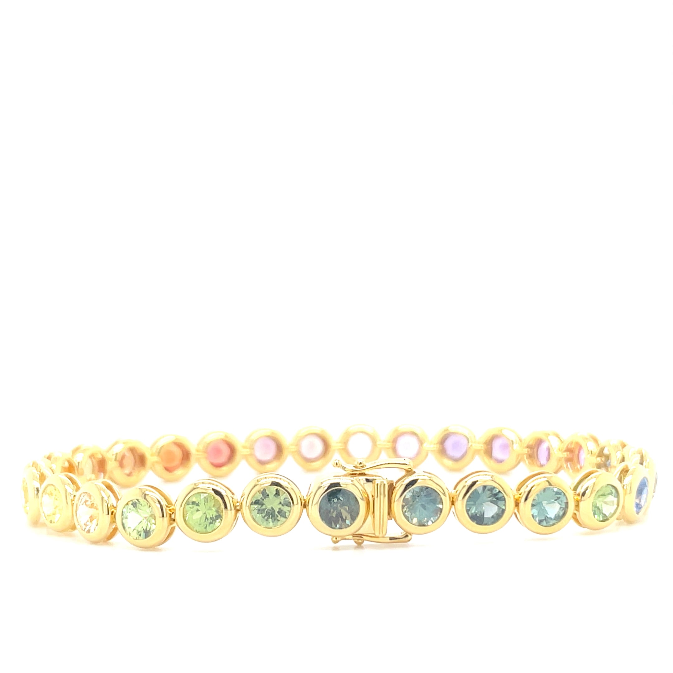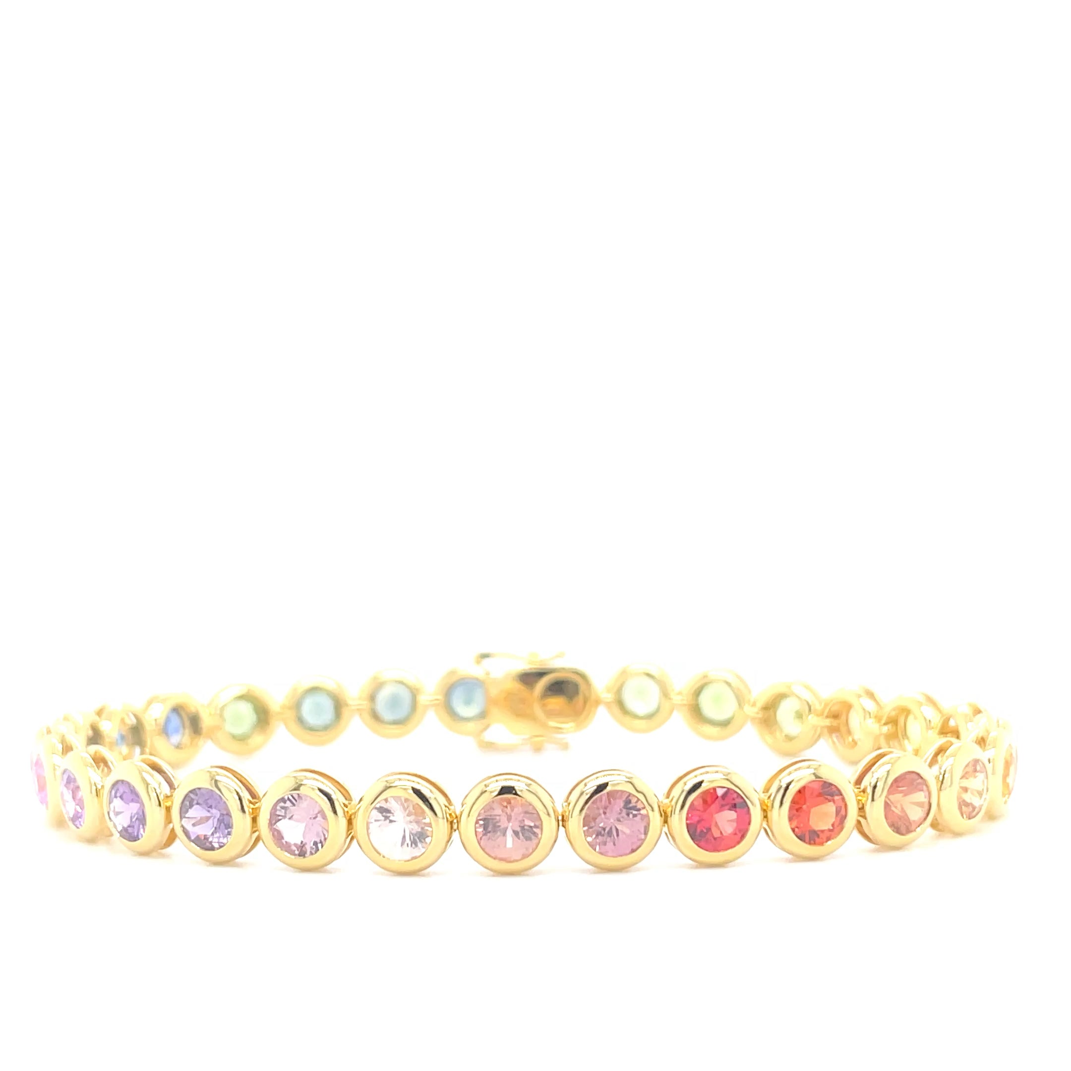 18kt geelgouden tennis armband bezet met regenboog saffier