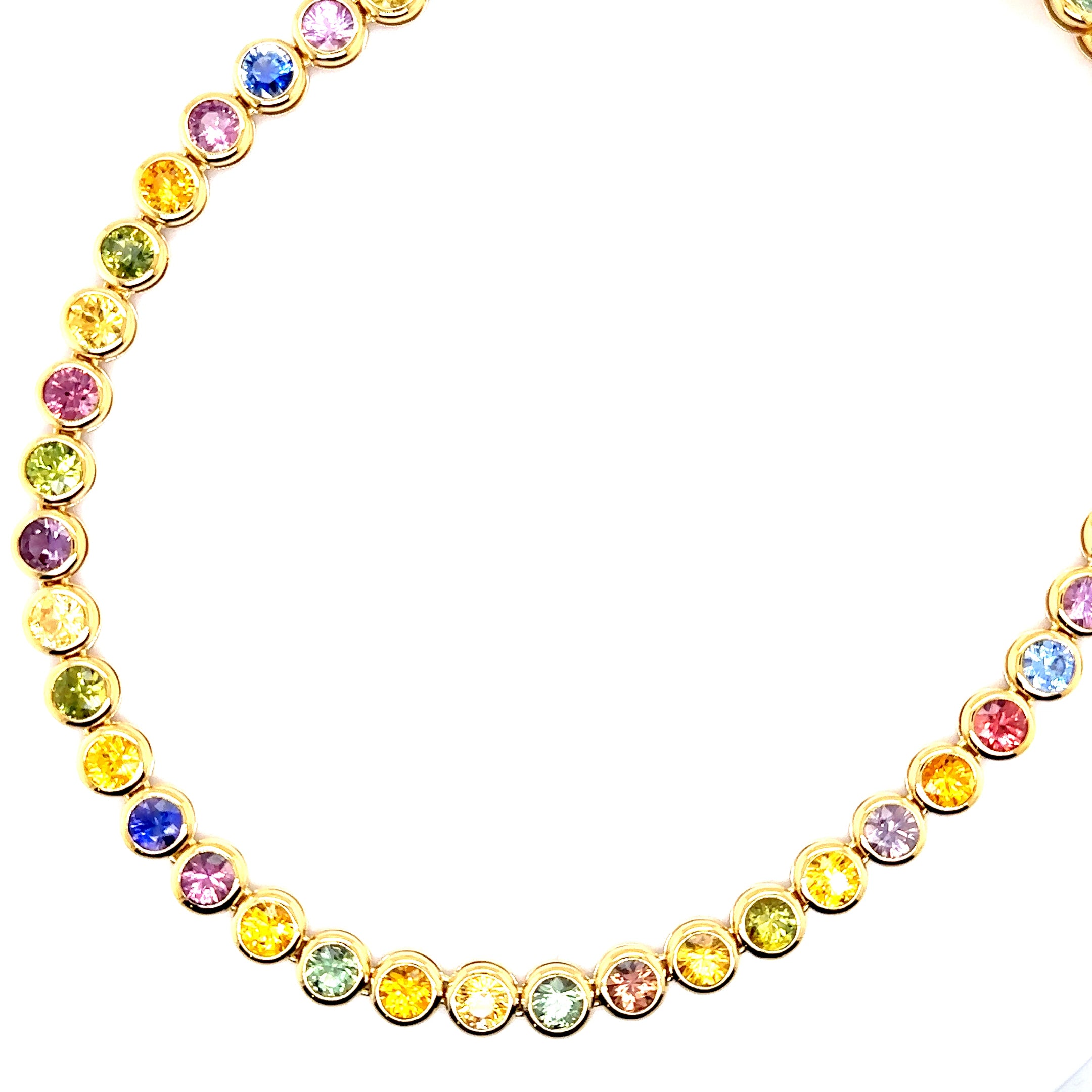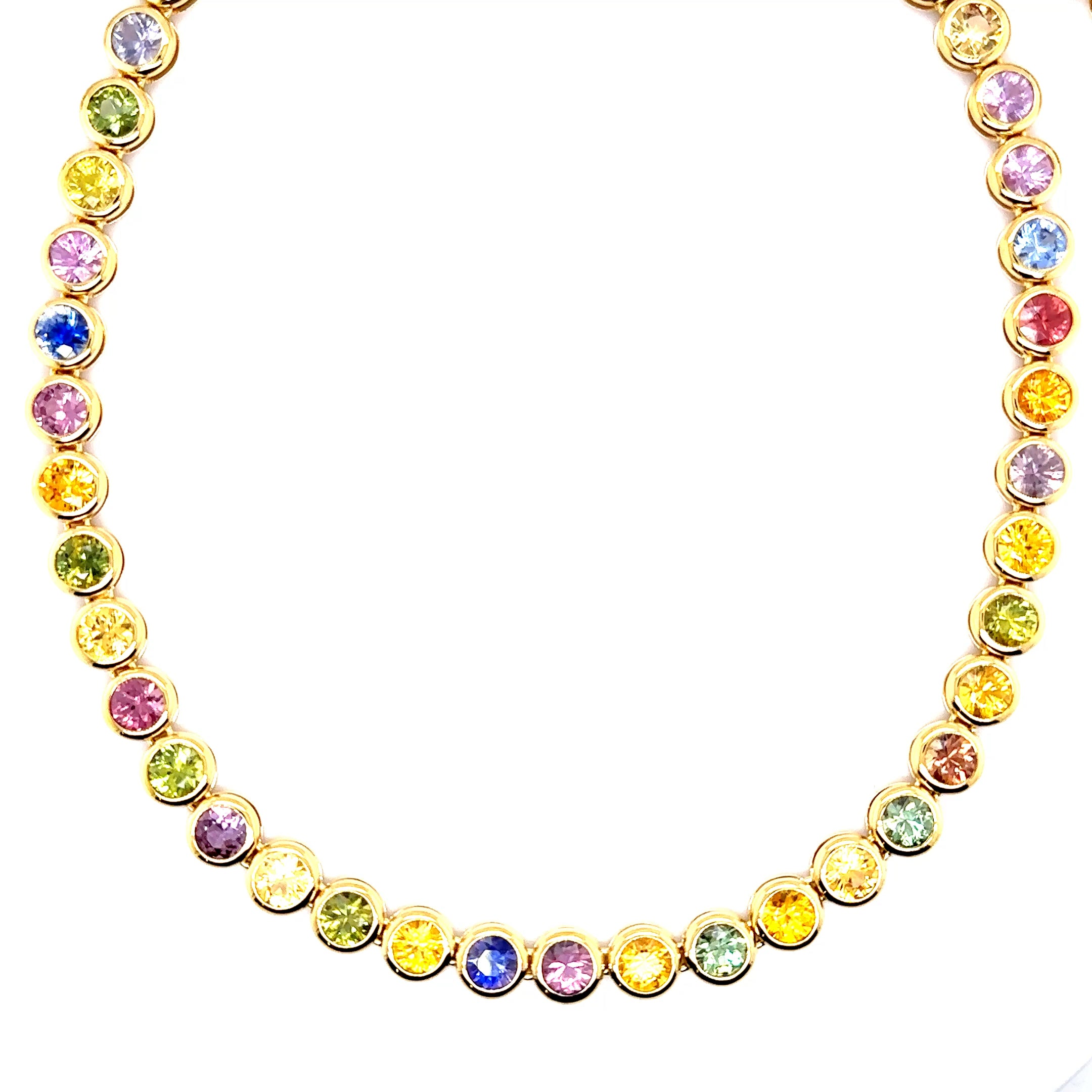 18kt geelgouden tennis collier bezet met regenboog saffier