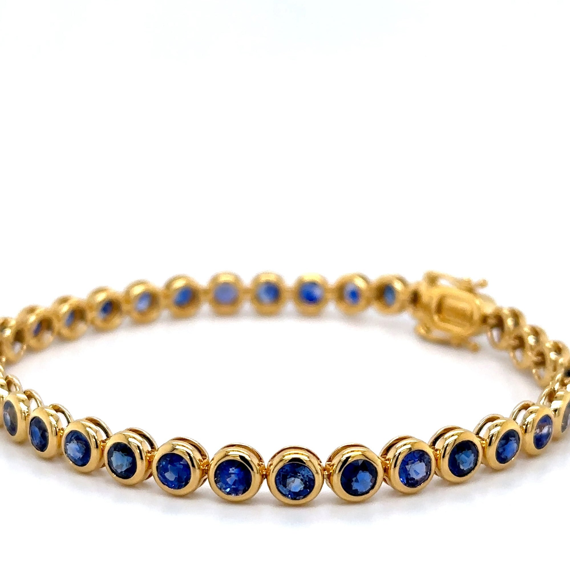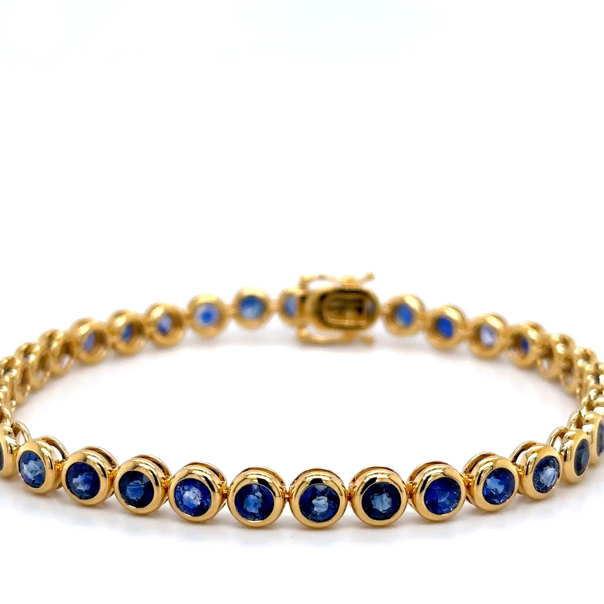 18kt geelgouden tennis armband bezet met blauwe saffier