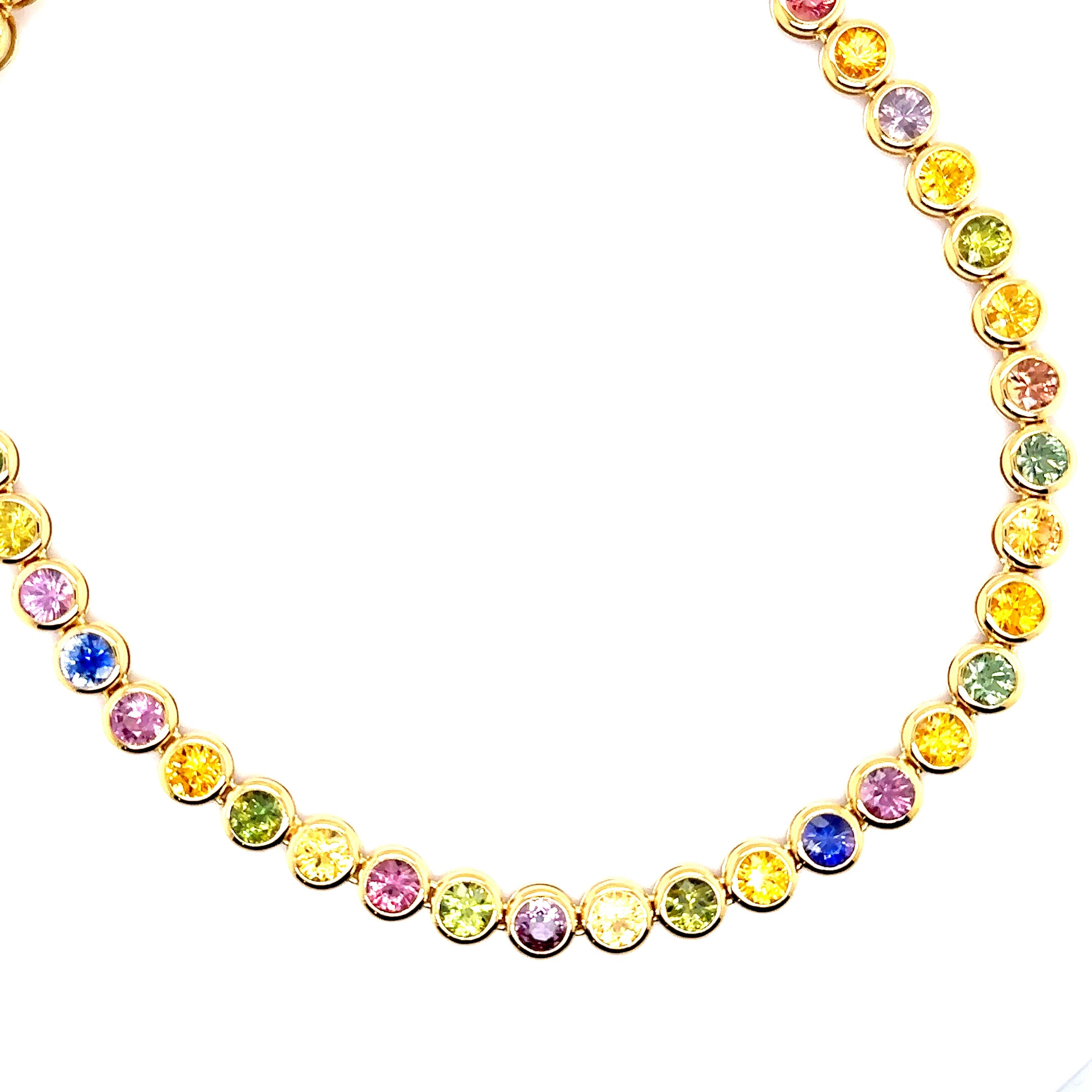 Dit 18kt geelgouden tennis collier is bezet met briljant geslepen, multicolor saffieren. De saffieren zijn in de regenboog kleuren verlopend met een totaal gewicht van 31.73ct.