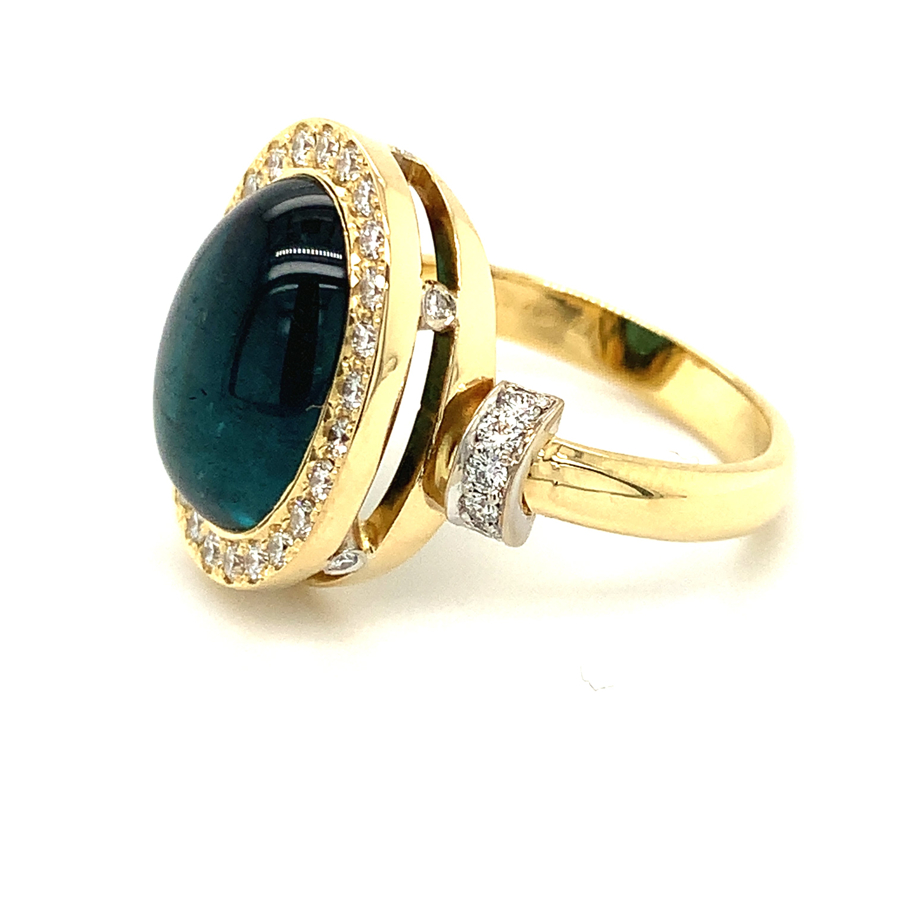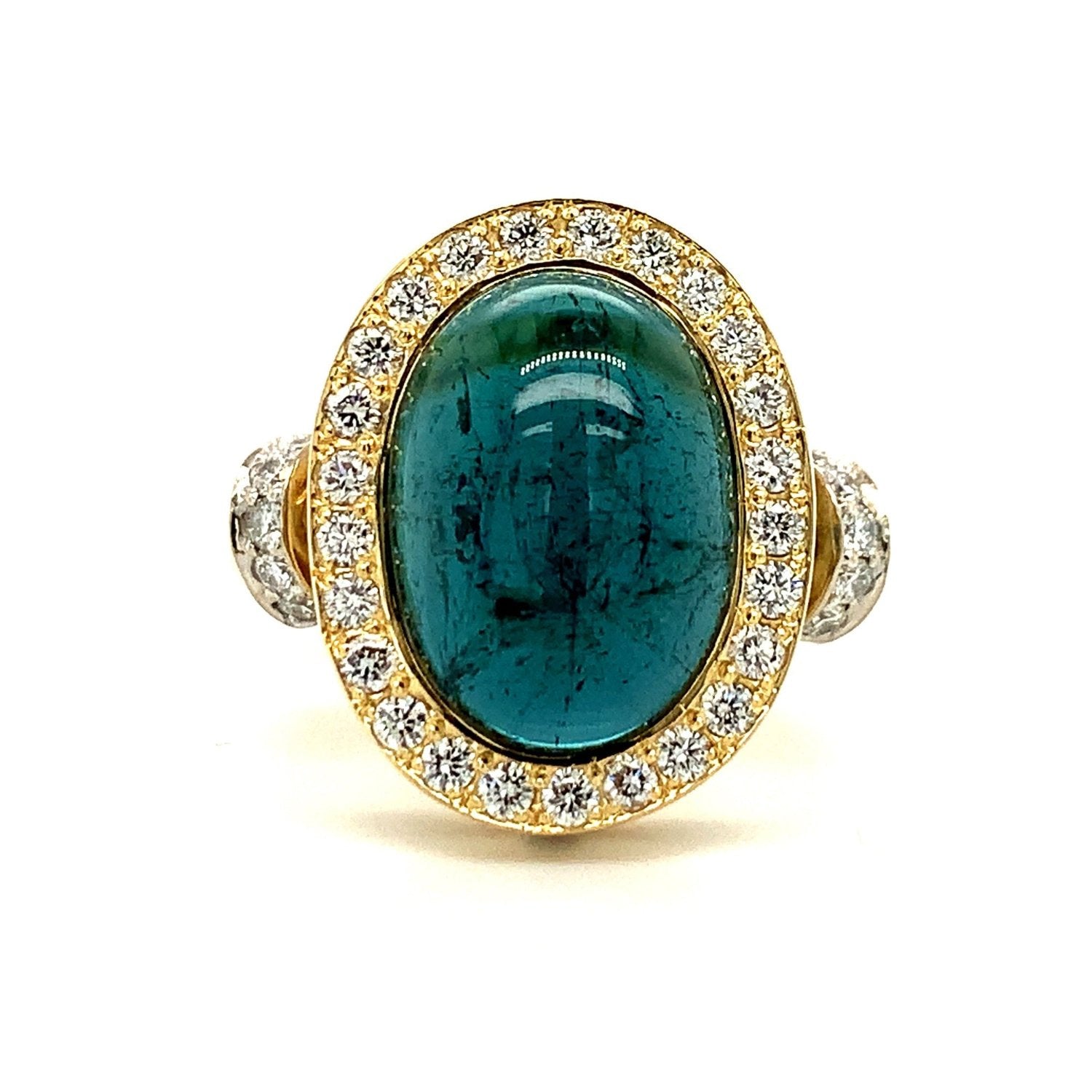 Este anillo hecho a mano en oro amarillo y blanco de 18 quilates está engastado con turmalina indigolita de talla cabujón y diamantes.