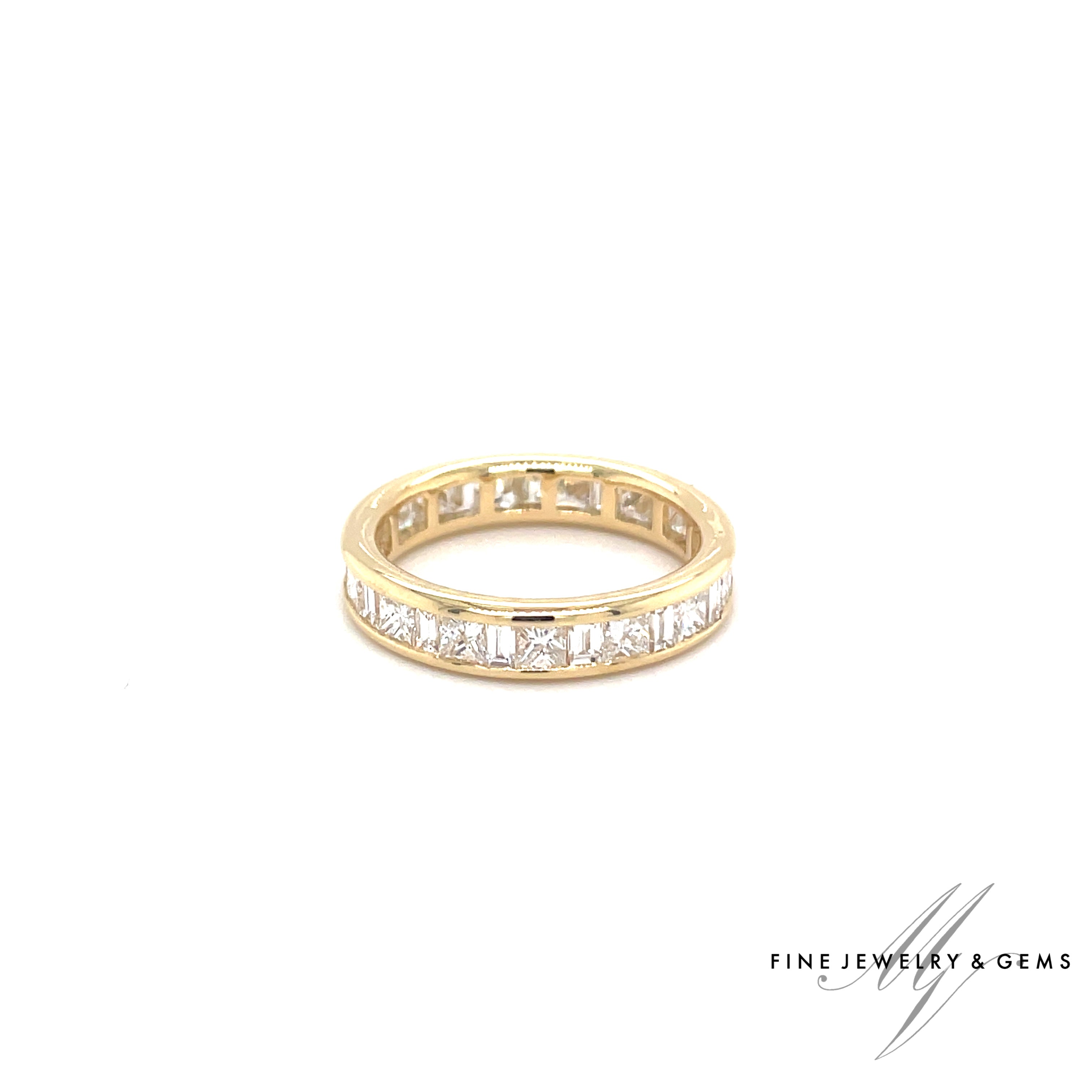 Este anillo de alianza de oro amarillo de 18 quilates está engastado con un total de diamantes de talla baguette y diamantes de talla princesa de 2,28 quilates.