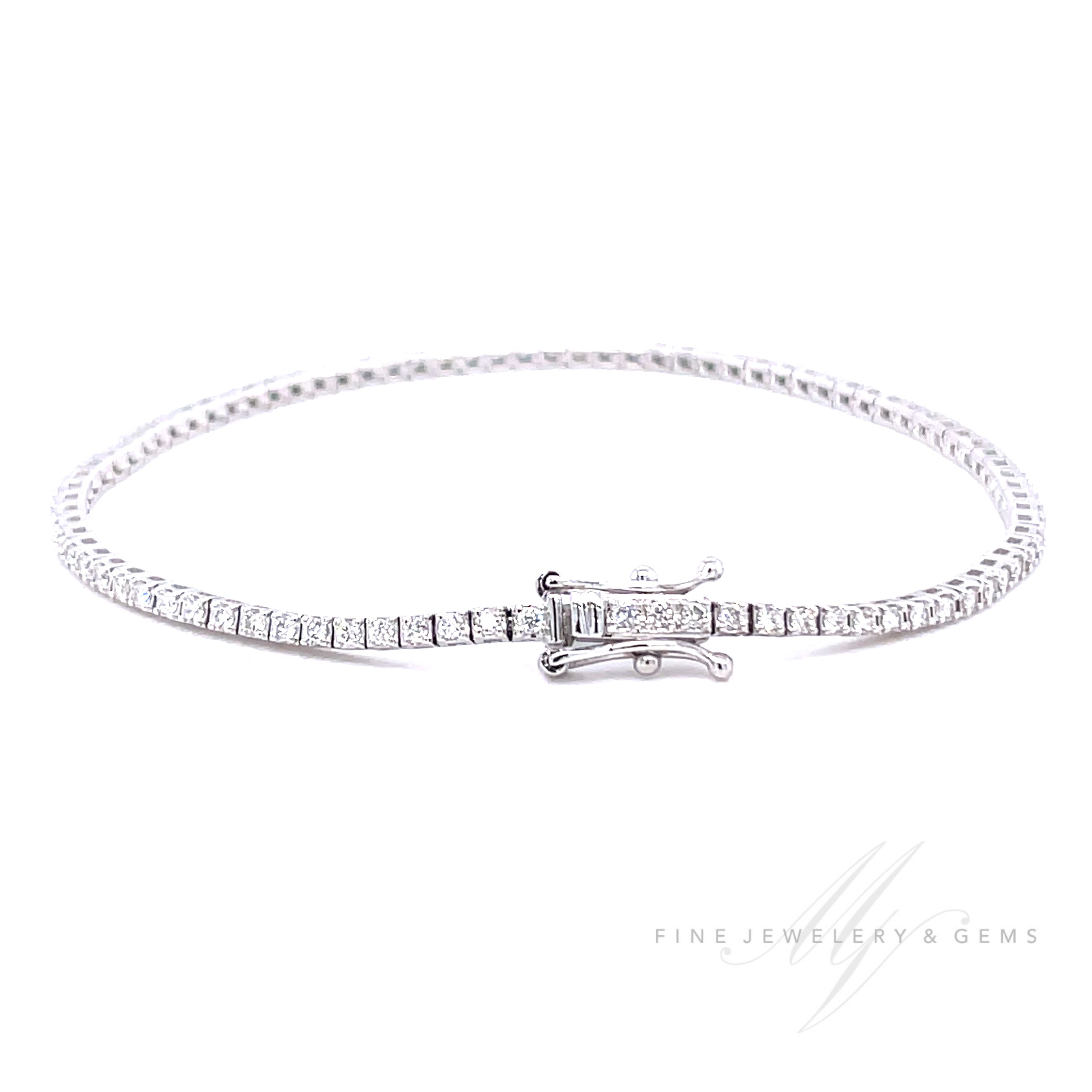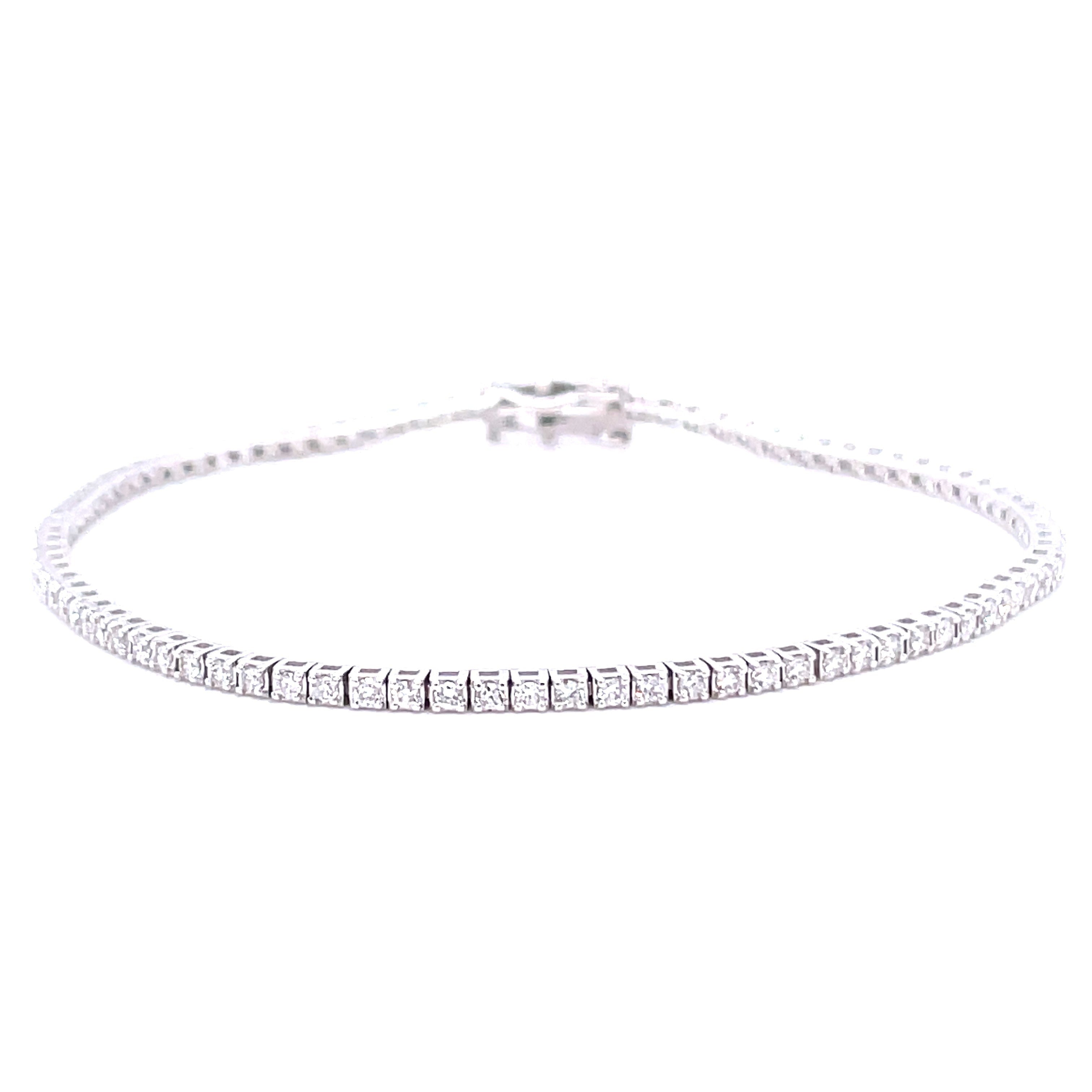 Esta pulsera de tenis de oro blanco de 18 quilates está engastada con un total de diamantes de talla brillante de 1,13 quilates. El cierre tiene 2 8 de seguridad.