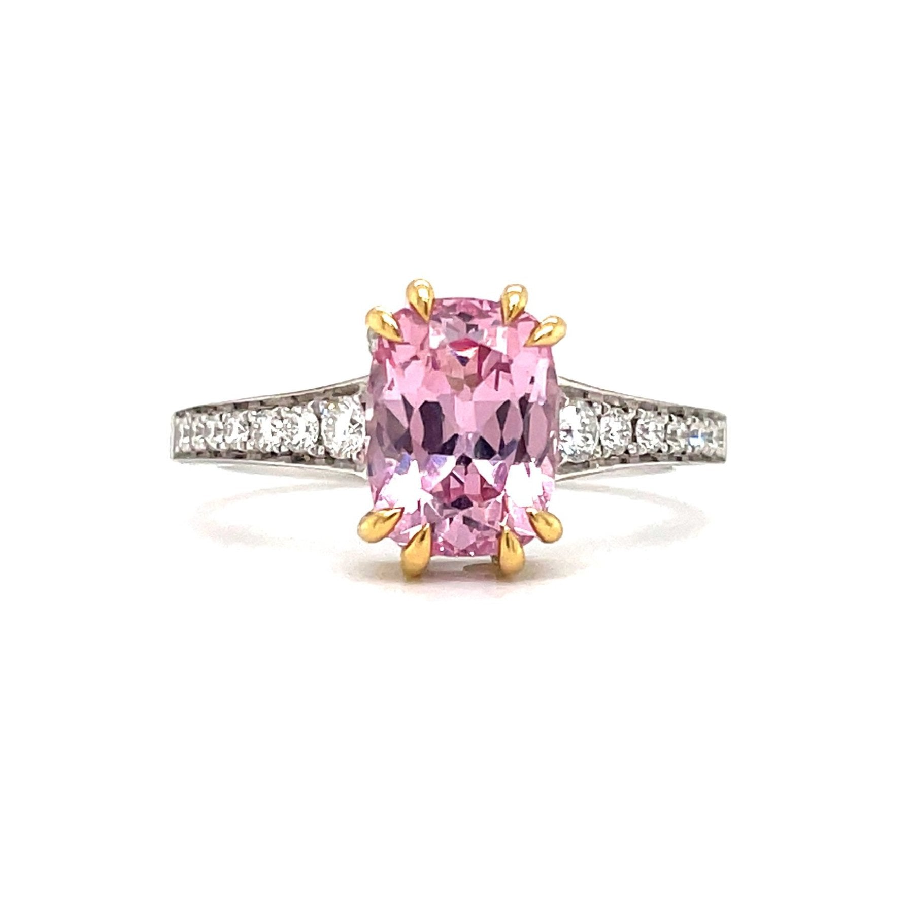 Bague en or blanc 18 kt sertie d'un spinelle rose unique et de 12 diamants.