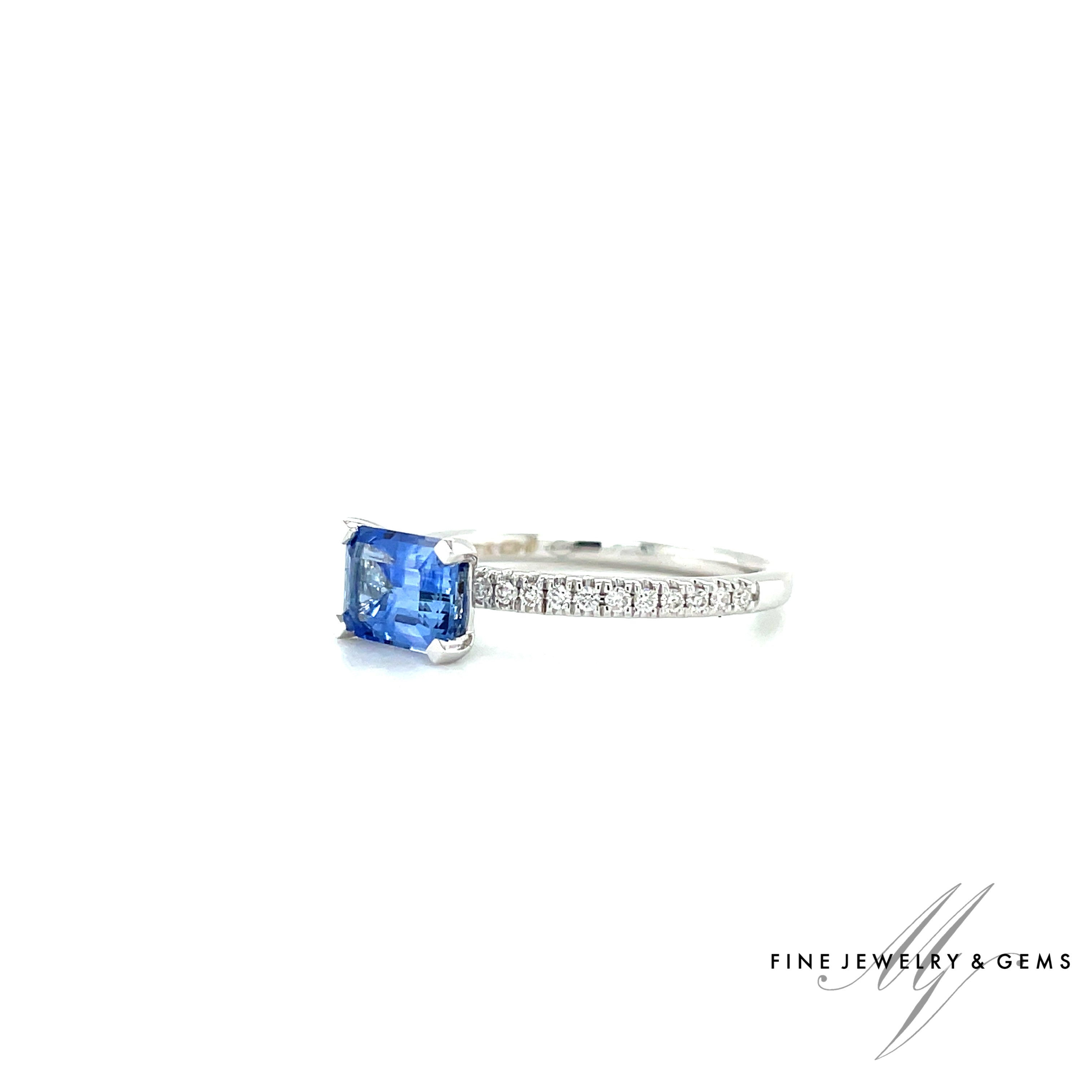 Stenen: 1.20ct Verhitte blauwe saffier baquette geslepen & 0.14ct VS F briljant geslepen diamanten
