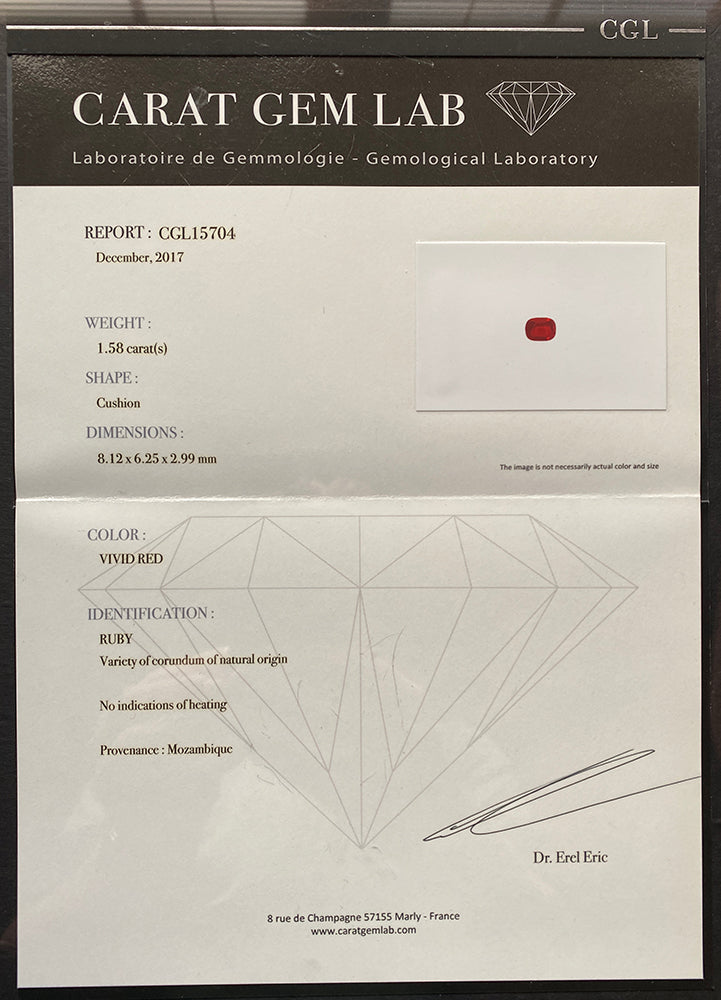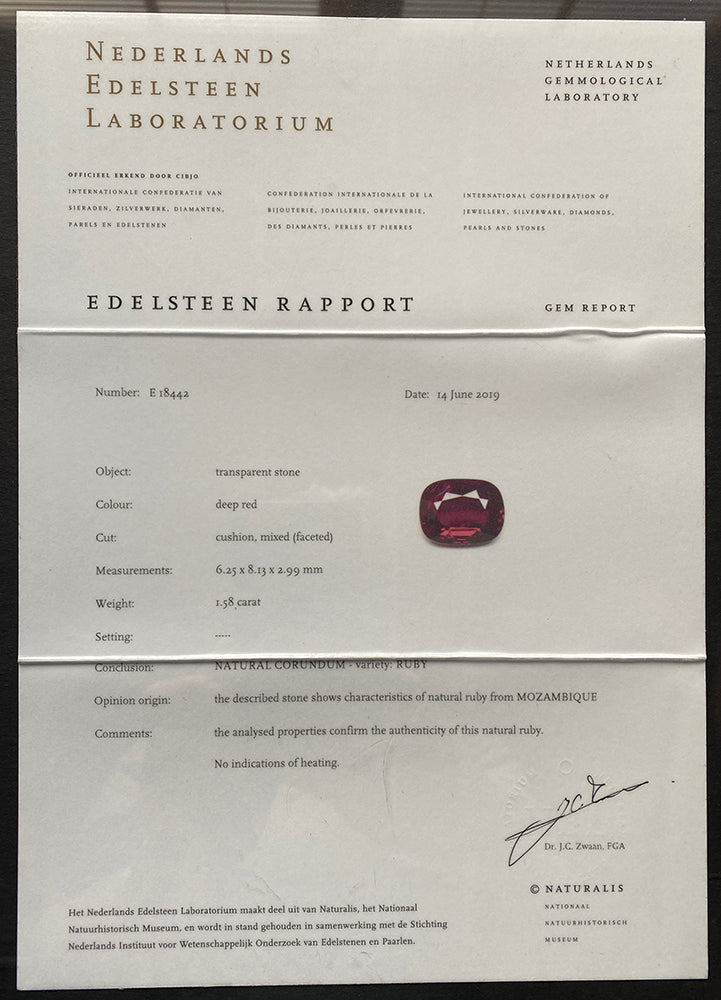 Intens rode robijn met een hoge transparantie van 1,58 caraat. Deze robijn van hoge kwaliteit is afkomstig uit De Capo Delgado provincie in het noorden Mozambique. Hier worden tegenwoordig de beste robijnen gedolven. Deze steen is perfect voor gebruik als ringsteen of als waardevaste investering.
