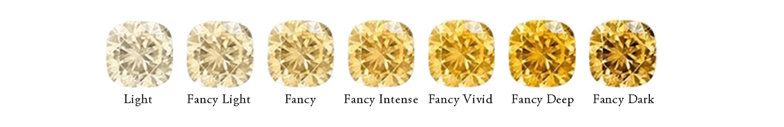 彩色钻石按照颜色强度的增加进行分级:淡色、极淡色、浅色、淡彩、彩色、浓彩、艳彩、深色和深彩。