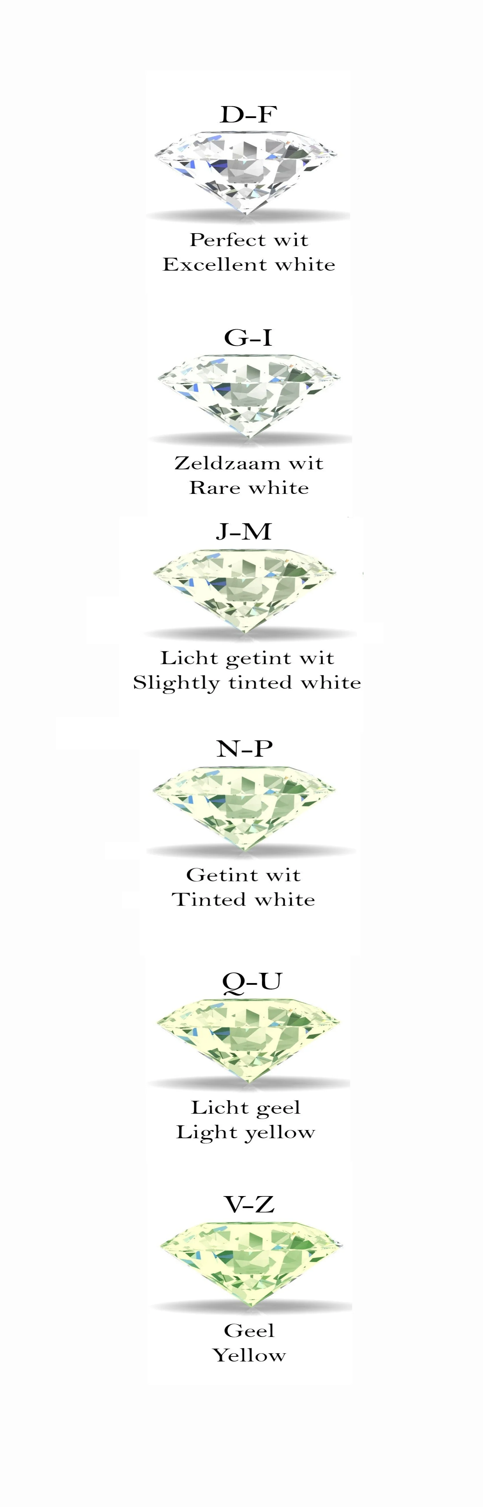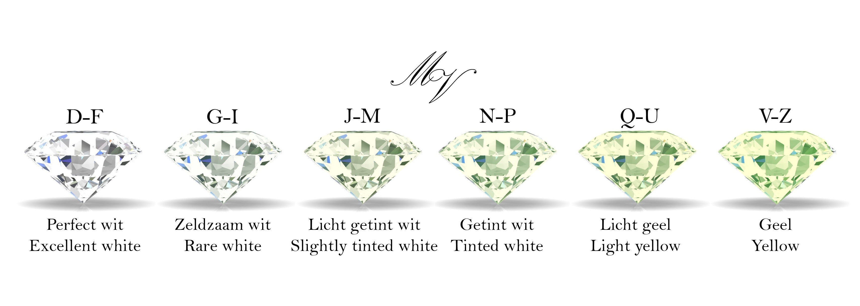 值得注意的是,颜色是指钻石中没有颜色,这实际上表明了白度。钻石的颜色呈淡黄色。颜色越少,色阶越高。颜色等级 D 是最高的,Z 是最低的。在我的收藏中,您只能找到 J 及更高的颜色等级。
